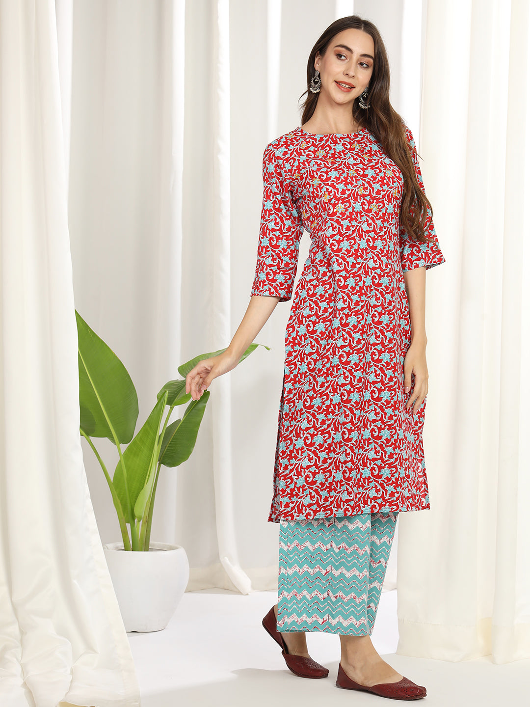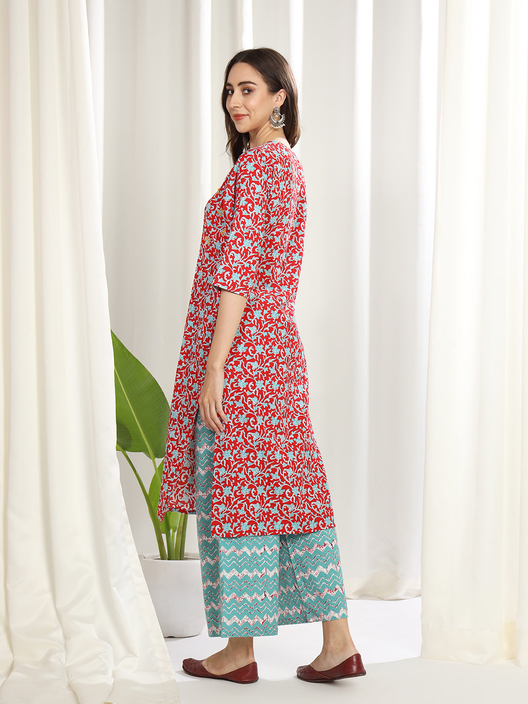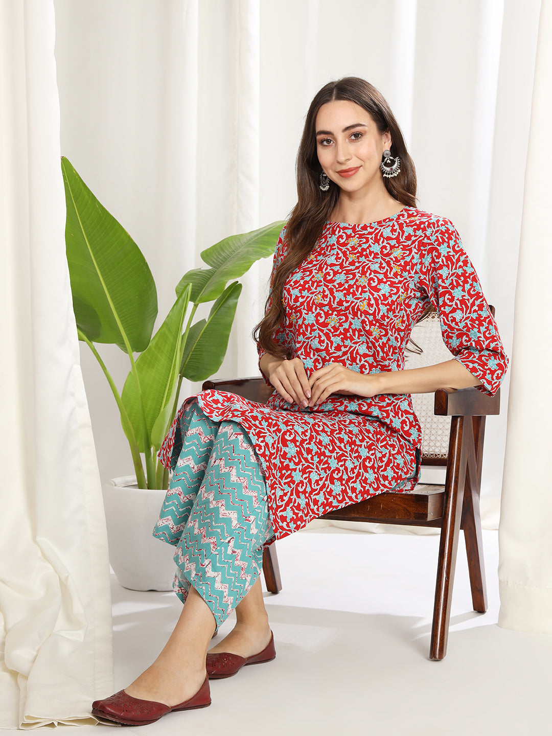 Red organic cotton kurti with floral print . It has 3/4 sleeves paired with palazzo pant . The pant has all over elastic at the waist.