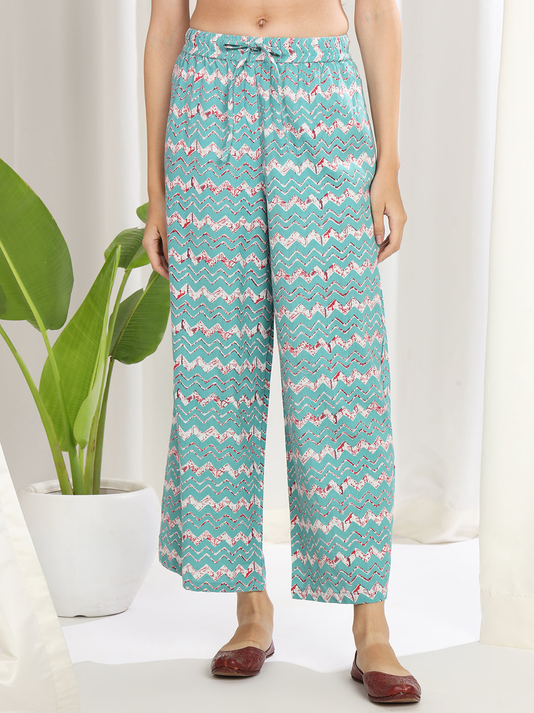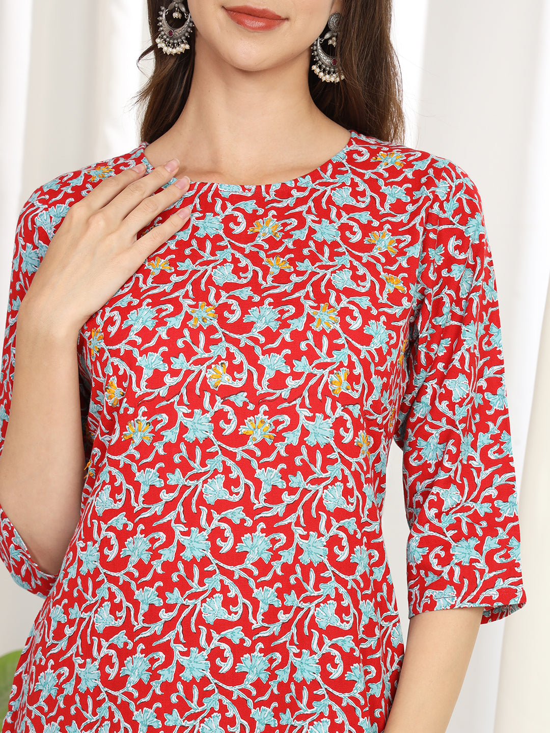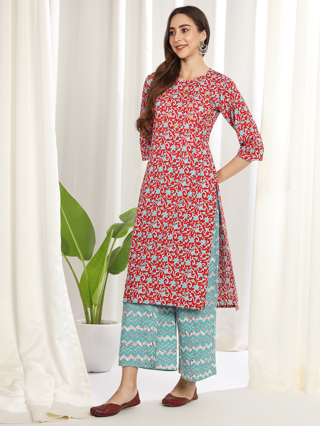 Red organic cotton kurti with floral print . It has 3/4 sleeves paired with palazzo pant . The pant has all over elastic at the waist.