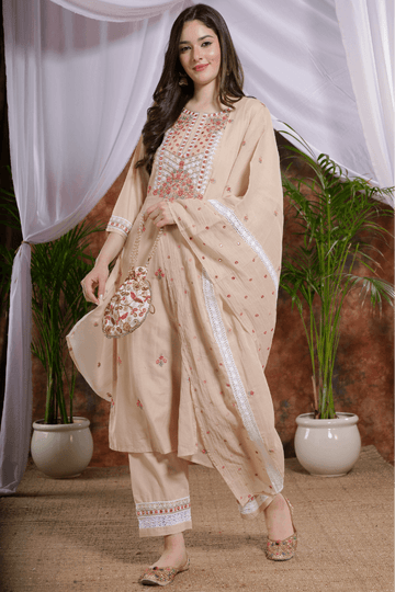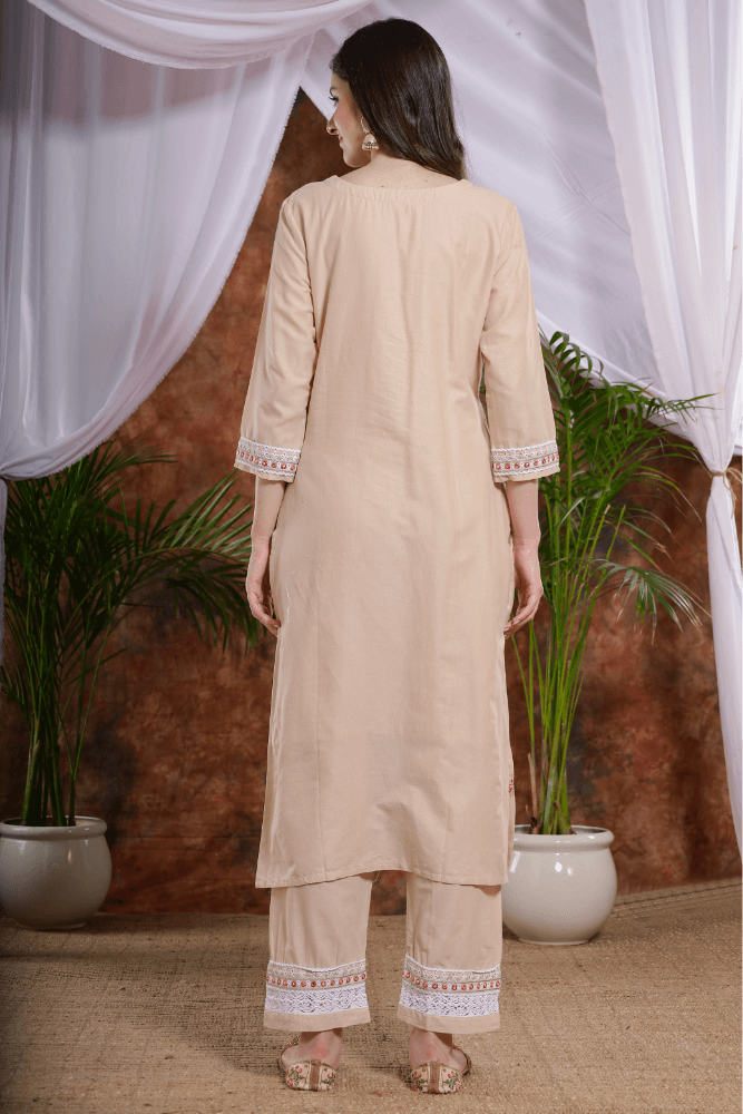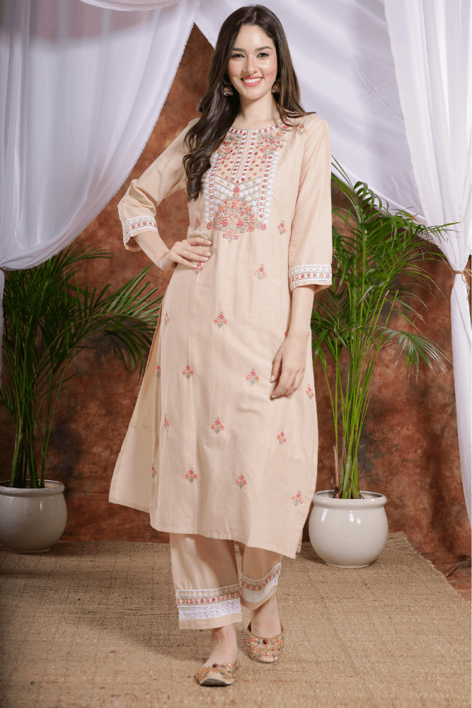 This peach straight suit set is made from pure cotton Kurta features a straight silhouette, round neck and three forth sleeves. Complete the look with matching pants and dupatta