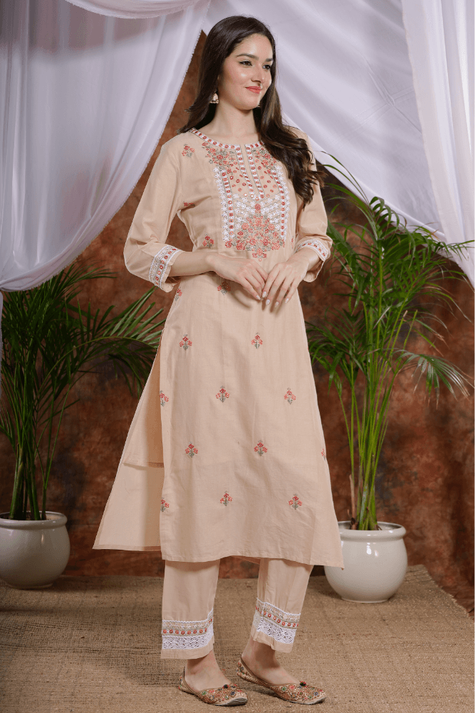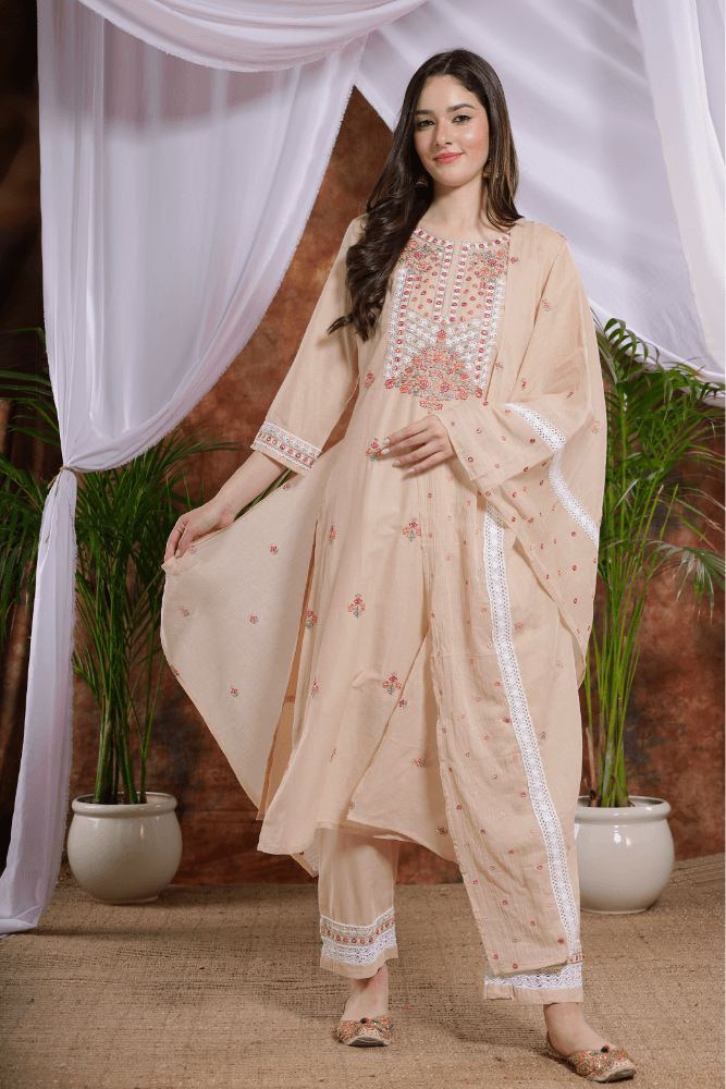 Peach Cotton Straight Kurta pant Suit and cute flowers embroidery dupatta