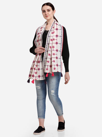 White hand picky khadi cotton casual stole/scarf is embroidered with chain stich two color thread, it is fenced from one side by cotton dyed bundi lace embellished with hand made tassels on its two ends .the stole is Perfect for your casual outfit. its a multi seasonal stole can be wore in any season on any outfit. The khadi fabric gets softer after every wash this makes it special